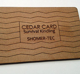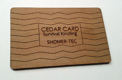 The Cedar Card is a survival kindling card made from a solid piece of Western Red Cedar, known for its hot burn (even when damp) due to its natural oils and resins. It's pre-scored and ready for breaking into pieces and forming a fire base. Works great when using magnesium shavings and ferrocerium or even just a match. Size:  3.37” x 2.13” x 0.10”. Weight: 0.1 oz. Sustainably grown and made in USA.